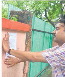 पूर्व शिक्षक संघ अध्यक्ष डॉ. डीडी बेदिया माधवनगर थाना टीआई राकेश मोदी से चर्चा करते हुए। दूसरे चित्र में यूनिवर्सिटी के मकान में रह रहे बाहरी अफसरों के घर के बाहर भी चिपकाया चेतावनी पत्र।