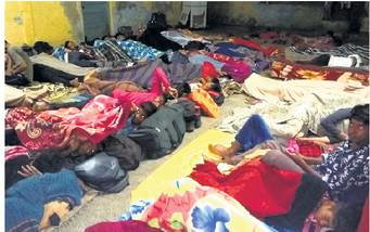 हॉस्टल के एक कमरे में अव्यवस्थित रूप से सोए विद्यार्थी।