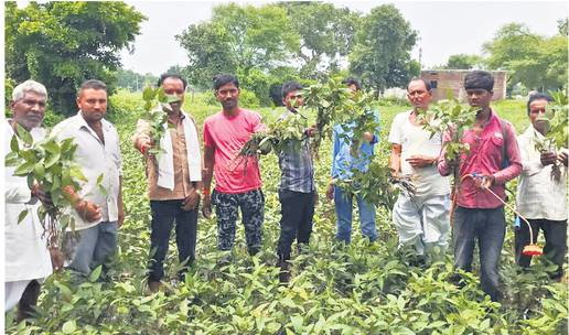 लोध गांव में सोयाबीन की प्रभावित फसल दिखाते किसान। उनका कहना है पौधे अंदर ही अंदर खोखले हो रहे हैं।